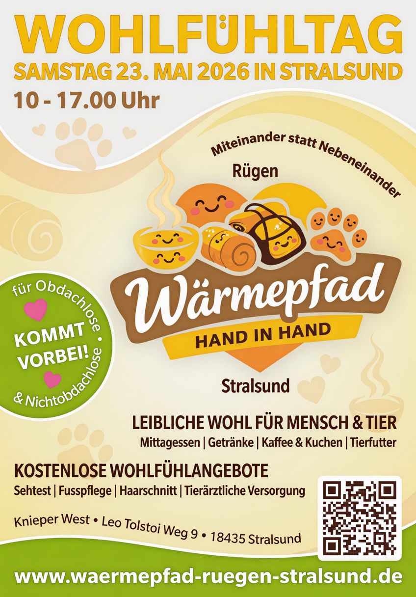 Am 23. Mai 2026 organisiert der ehemalige obdachlose Michael Richter zusammen mit der Unternehmerin Elke Ehlers in Stralsund den sogenannten „Wärmepfad“ – eine besondere Hilfsaktion für obdachlose und von Armut betroffene Menschen. Ziel ist es, Unterstützung dort anzubieten, wo sie dringend gebraucht wird: Direkt auf der Straße, niedrigschwellig und menschlich.„Ich habe selbst so viel Glück...