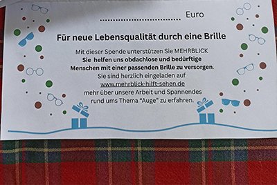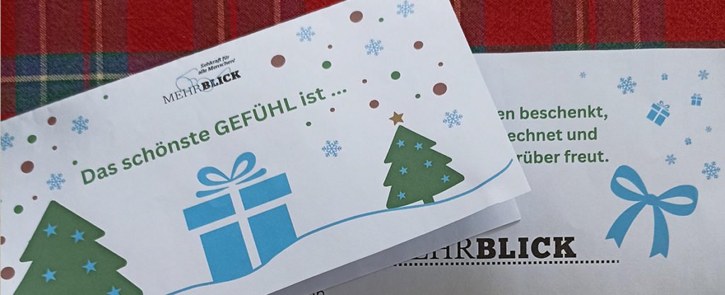 Weihnachten etwas Gutes tun? Wie wäre es mit einer finanziellen Spende für Bedürftige? Mit einer MEHRBLICK-Spende schenken Sie mehr als nur eine Brille. Sie schenken mehr Sicherheit, Lebensqualität und Teilhabe. Eine ansprechend gestaltete MEHRBLICK-Urkunde unterstreicht den Wert Ihres Weihnachtsgeschenks. Sie baut eine direkte Verbindung zwischen Ihnen, MEHRBLICK und den Menschen auf, die dringend Hilfe benötigen. So wird gutes Tun greifbar und nahbar.