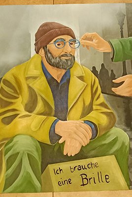 Geschmückt wurde unser Stand ganz künstlerisch: Ein Weihnachtsgeschenk aus der Sprechstunde im Dezember vergangenen Jahres in Mannheim. Eine Optikerin, die in Ihrer Freizeit Wandgemälde anfertigt, malte exklusiv für MEHRBLICK. Zu sehen ist ein Mann, der auf der Straße sitzt und eine blaue Brille gereicht bekommt. Die ausdrucksstarken Augen des Mannes zogen viele Blicke auf sich.